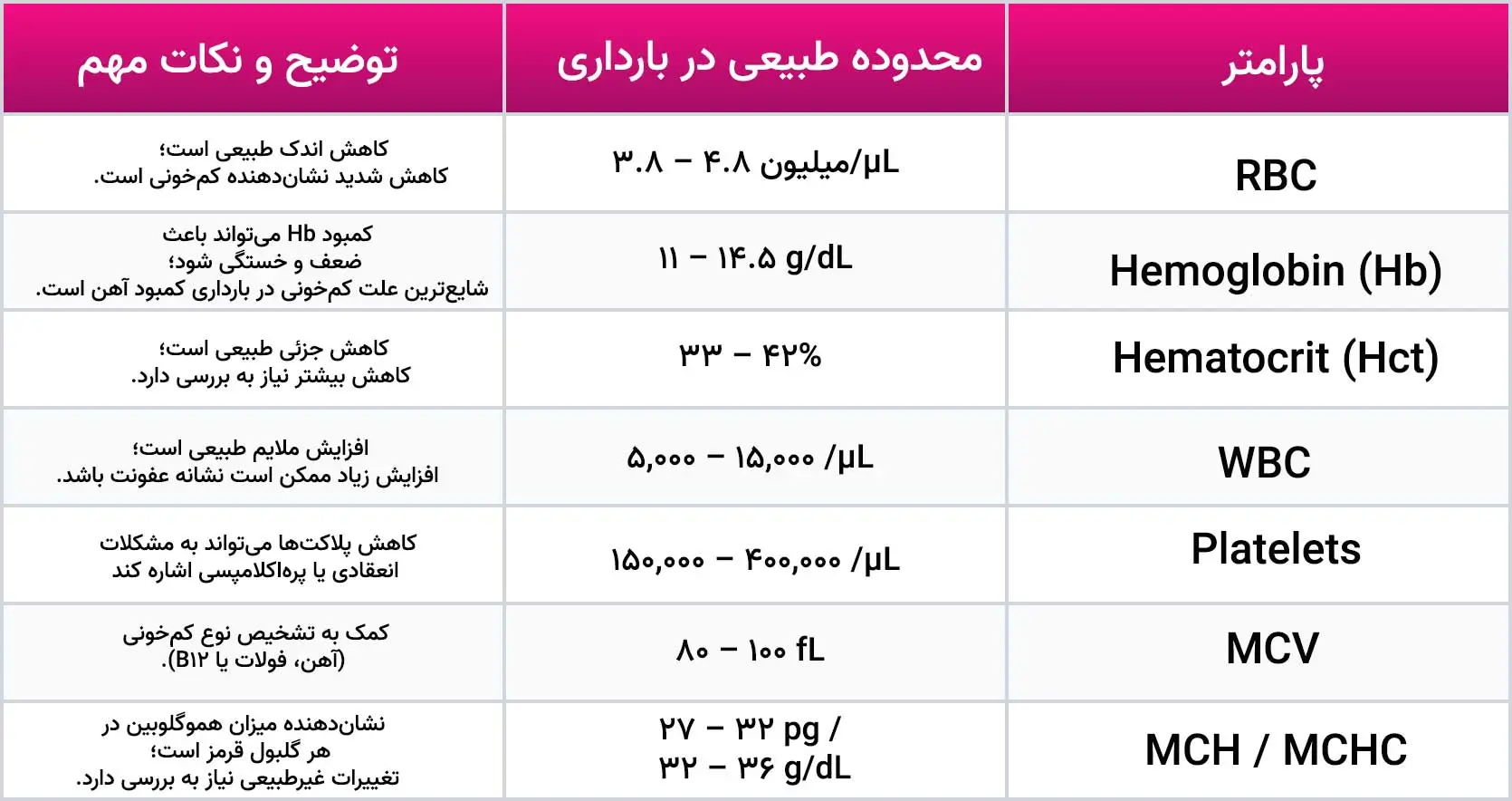 •    RBC و هموگلوبین (Hb): در دوران بارداری حجم خون افزایش می‌یابد و معمولاً هموگلوبین کمی کاهش می‌یابد. کاهش شدید Hb می‌تواند نشان‌دهنده کم‌خونی بارداری باشد.
